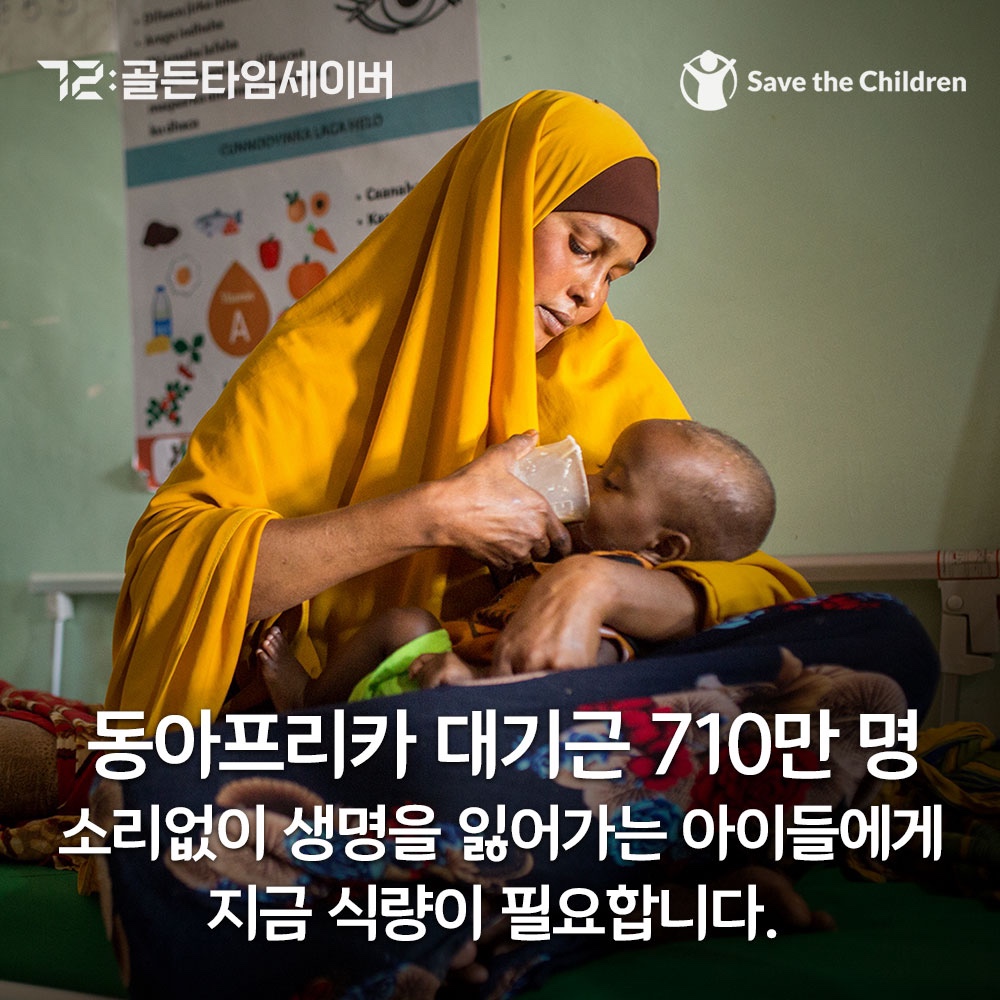 영양실조로 힘없이 늘어진 동아프리카 아이의 모습이 진부해 보이시나요? 10개월 된 아기 굴레드가 말라가는 모습을 지켜볼 수 밖에 없었던 엄마 아샤는 단 하루도 이 고통이 진부하게 느껴진 적이 없습니다. 다행히 세이브더칠드런이 운영하는 보건소에서 치료를 받았지만, 아기의 미래는 아직 안전하지 않습니다.