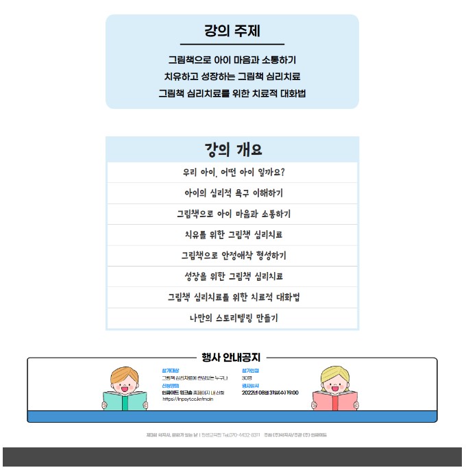 - 교육대상: 그림책 심리치료에 관심 있는 누구나