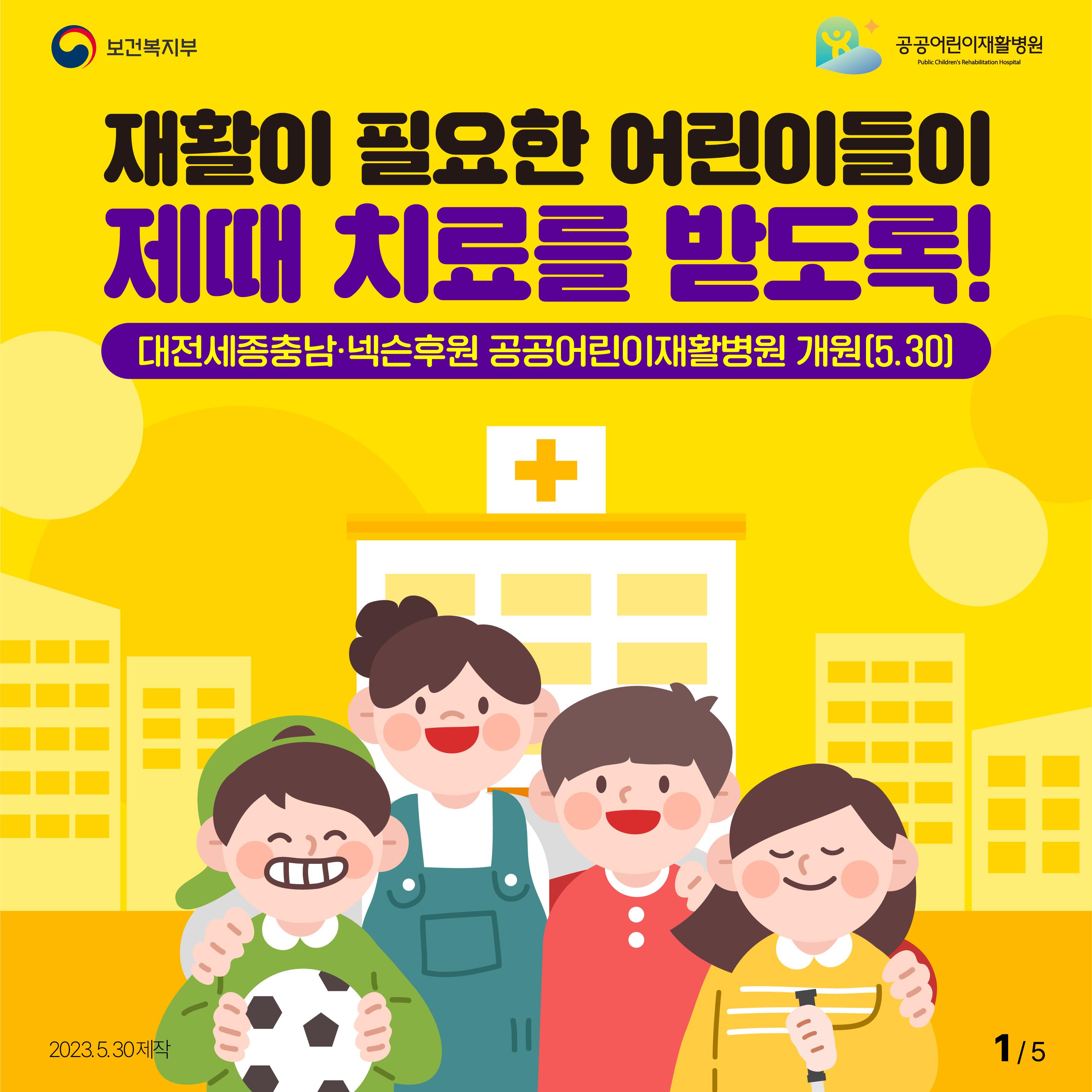 대전 공공어린이재활병원은 권역별 공공어린이재활병원 첫 건립 사례로서 총 494억 원의 건립비(국비 100억 원, 시비 294억 원, 후원기업 기부금 100억 원)가 투입되었으며, 재활의학과, 소아청소년과, 치과 등 진료과에 70병상(입원 50, 낮병동 20) 규모로 충남대학교병원이 수탁 운영한다.