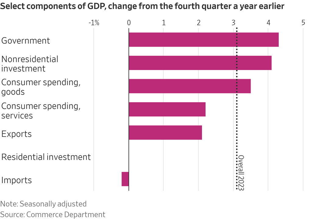 2023년에는 경기 침체가 나타나지 않았습니다. 소비자들은 확인했습니다. 미국 경제는 4분기에 전년 동기 대비 3.1% 성장했다고 미국 상무부가 목요일 발표했습니다. 탄력적인 노동 시장이 강력한 소비자 지출을 뒷받침하고 경기 침체에 대한 우려를 불식시켰습니다. 1년 전 경제학자들은 경기 침체 가능성이 매우 높다고 보고 올해 0.2%의 빈약한 성장을 예상했습니다. 하지만 경제 성장은 오히려 가속화되었다고 WSJ 가브리엘 T. 루빈은 보고했습니다.