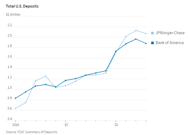 JPMorgan은 현재 10년 전의 거의 두 배에 달하는 2조 달러 이상의 예금을 보유하고 있습니다. 미국 연방예금보험공사 데이터에 따르면 2021년에는 뱅크 오브 아메리카를 제치고 최대 예금 보유 은행으로 등극했습니다. S&P 글로벌 마켓 인텔리전스에 따르면 경영진은 현재 12%에서 20%로 증가한 전체 예금의 20%를 모으는 것을 목표로 하고 있습니다.