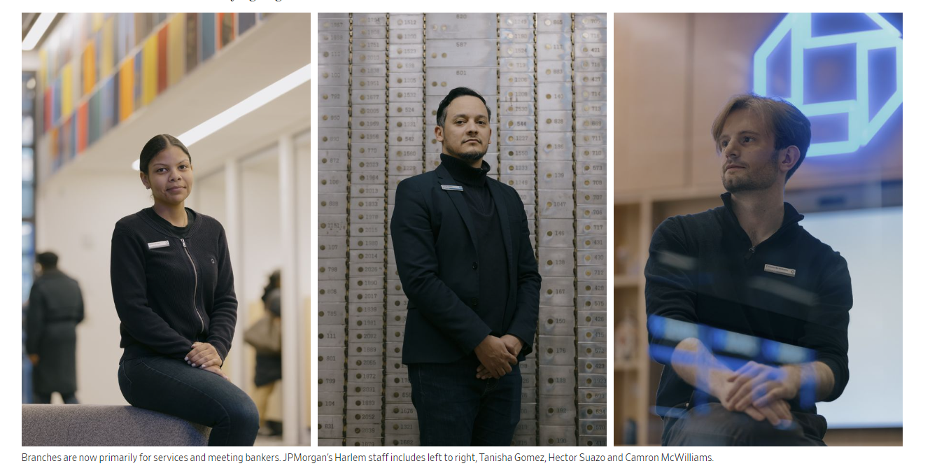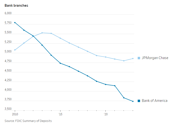 지점의 트래픽은 10년 전보다 줄어들었고, 고객들은 이제 대부분의 거래를 온라인이나 모바일 앱에서 처리합니다. 업계 전체로 보면 지난 10년 동안 수천 개의 지점이 문을 닫았습니다. JP모건과 뱅크오브아메리카 모두 6년 전보다 더 적은 수의 지점을 운영하고 있습니다.