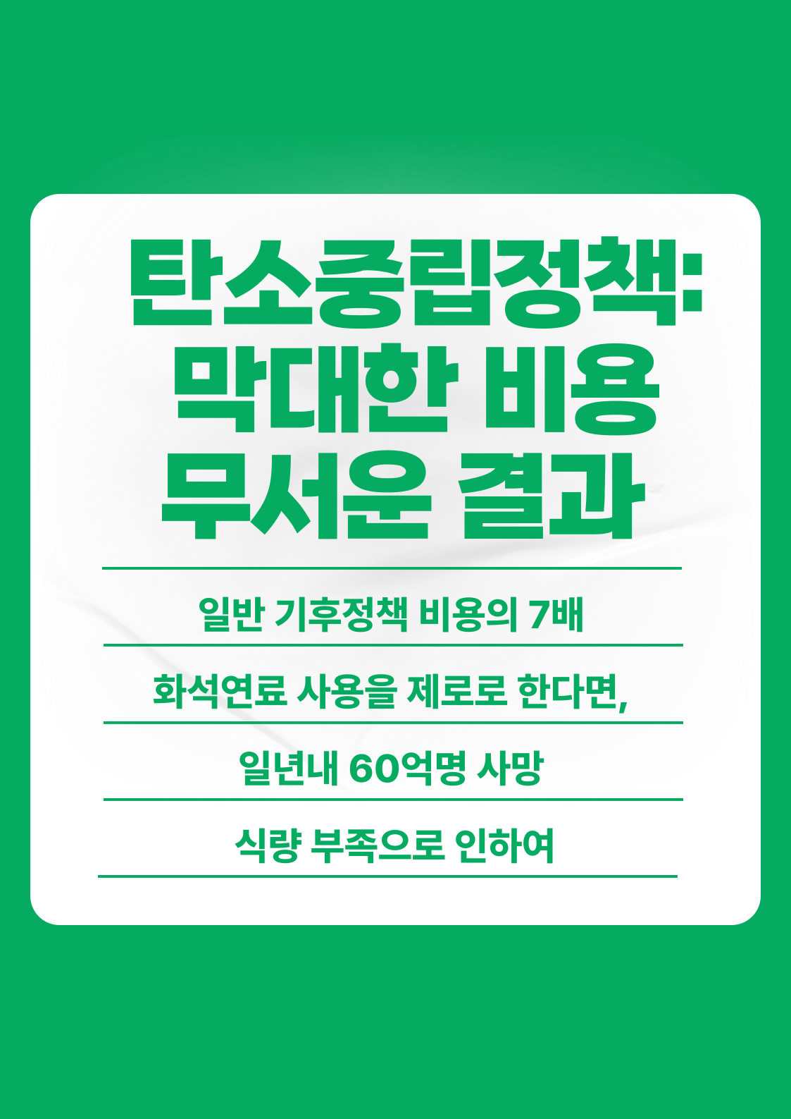 반면에 엄격한 탄소중립 기후 정책은 엄청난 비용이 소요될 것입니다. 최근 학술지에서 발표된 기후 경제학 연구에 따르면 총 비용은 한 세기 동안 매년 평균 27조 달러로, 2100년에는 연간 60조 달러에 달할 것으로 예상됩니다. 탄소중립(net zero: 배출량을 줄이고 대기 중 이산화탄소를 흡수하는 방법을 통해 인간의 활동에 의해 발생하는 온실 가스의 양을 0(제로)로 만들자는 목표)은 해결하려는 기후 문제보다 7배 이상 비용이 많이 듭니다.