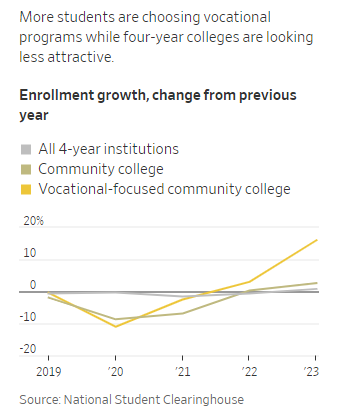 커뮤니티 칼리지와 4년제 대학의 전체 등록률이 감소함에 따라 직업 훈련 프로그램 등록이 급증하고 있습니다. 직업 중심 커뮤니티 칼리지에 등록한 학생 수는 작년에 16% 증가하여 2018년 전국 학생 정보 센터가 해당 데이터를 추적하기 시작한 이래 최고 수준을 기록했습니다. 같은 기간 동안 건설 기술을 공부하는 학생 수는 23% 증가했으며, HVAC 및 차량 유지보수 및 수리 관련 프로그램을 수강하는 학생 수는 7% 증가했습니다.
