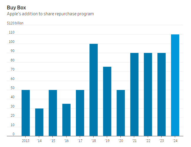 이는 목요일 오후 애플이 자사주 매입 프로그램에 추가했다고 밝힌 금액입니다. 이는 세계에서 두 번째로 가치가 높은 상장기업이 10여 년 전 자사주 매입을 시작한 이래 사상 최대 규모입니다. 이는 배당금 4% 인상과 함께 애플이 거의 4년 만에 아이폰 매출이 전년 대비 가장 큰 폭으로 감소한 회계연도 2분기에 대한 인상적이지 않은 보고서와 함께 발표되었습니다.