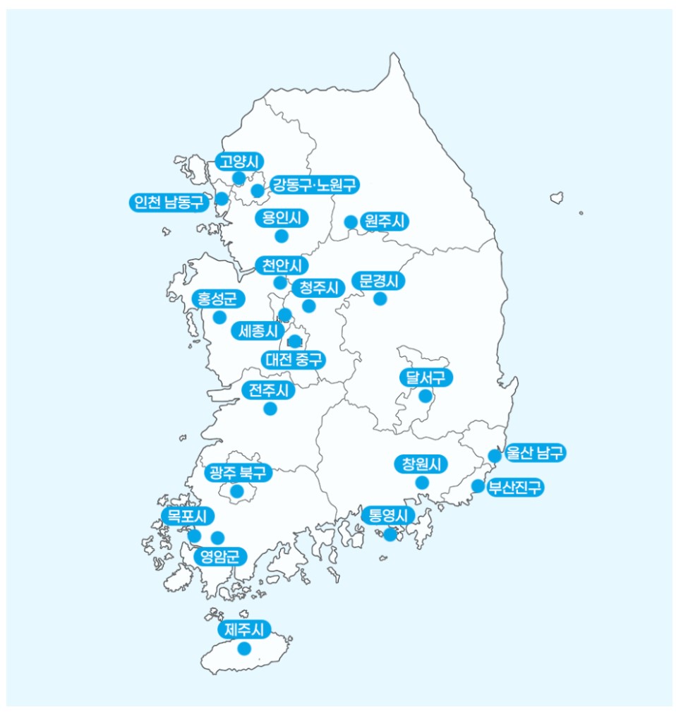 이번에 선정된 지역은 서울 강동구·노원구, 부산 부산진구, 대구 달서구, 인천 남동구, 광주 북구, 대전 중구, 울산 남구, 세종시, 경기 고양시·용인시, 강원 원주시, 충북 청주시, 충남 천안시·홍성군, 전북 전주시, 전남 목포시·영암군, 경북 문경시, 경남 통영시·창원시, 제주 제주시다.
