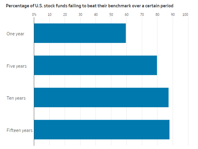 하지만 비용이 거의 들지 않는 바닐라 인덱스 펀드도 건초 더미에서 바늘을 찾는 것과 같습니다. 펀드 매니저를 믿고 그런 펀드를 찾아서 계속 보유하는 것은 좌절감을 안겨줄 수 있습니다. S&P 다우존스 인덱스에 따르면 한 기간에 우수한 성과를 낸 뮤추얼 펀드의 후속 투자 확률은 매우 낮습니다. 예를 들어, 2020년 미국 주식 뮤추얼 펀드의 43%만이 지수를 상회했습니다. 그 중 2.5%만이 향후 2년 동안 수익률을 유지했습니다.