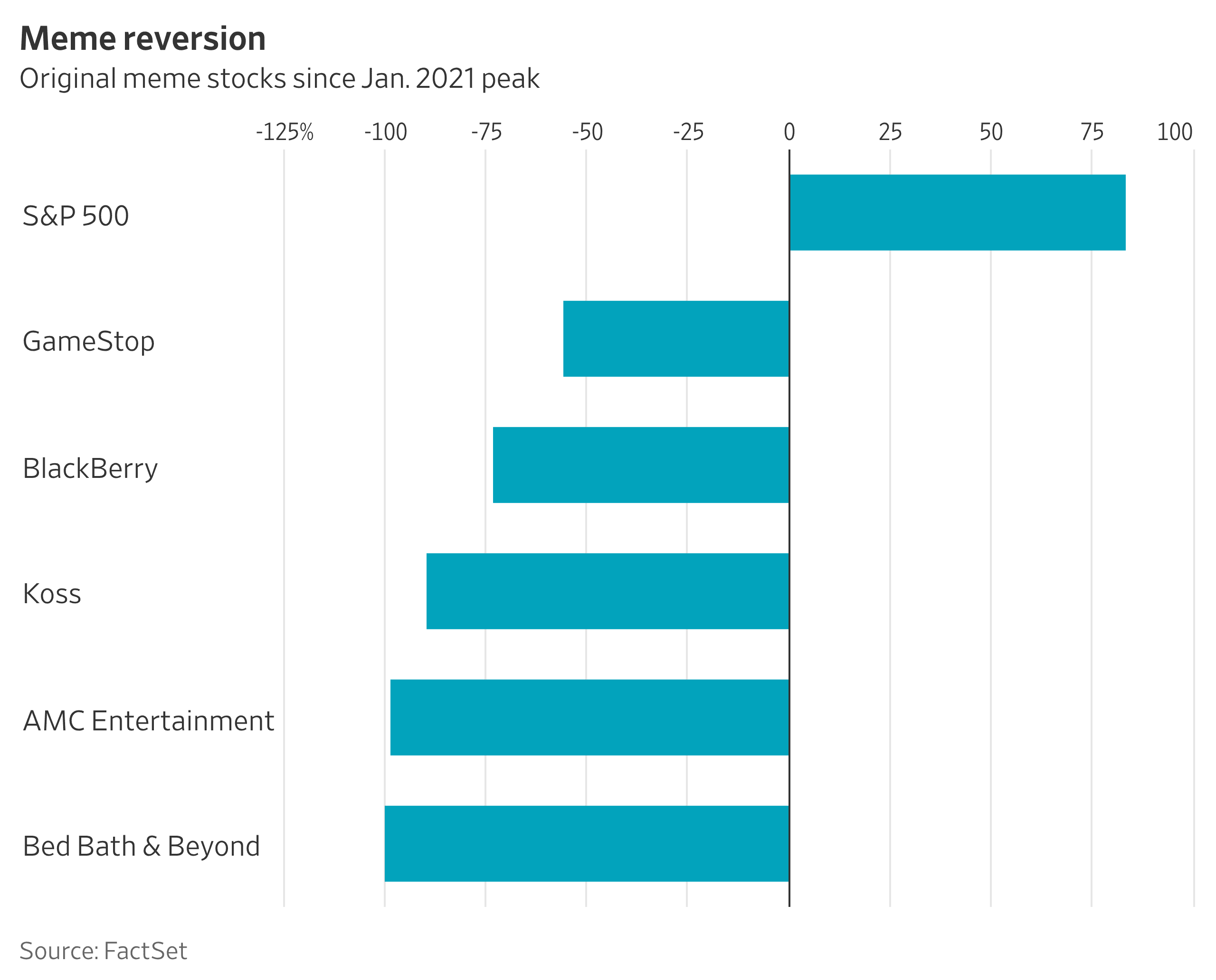 2021년 1월 정점 이후 원조 밈 주식들의 평균 회귀