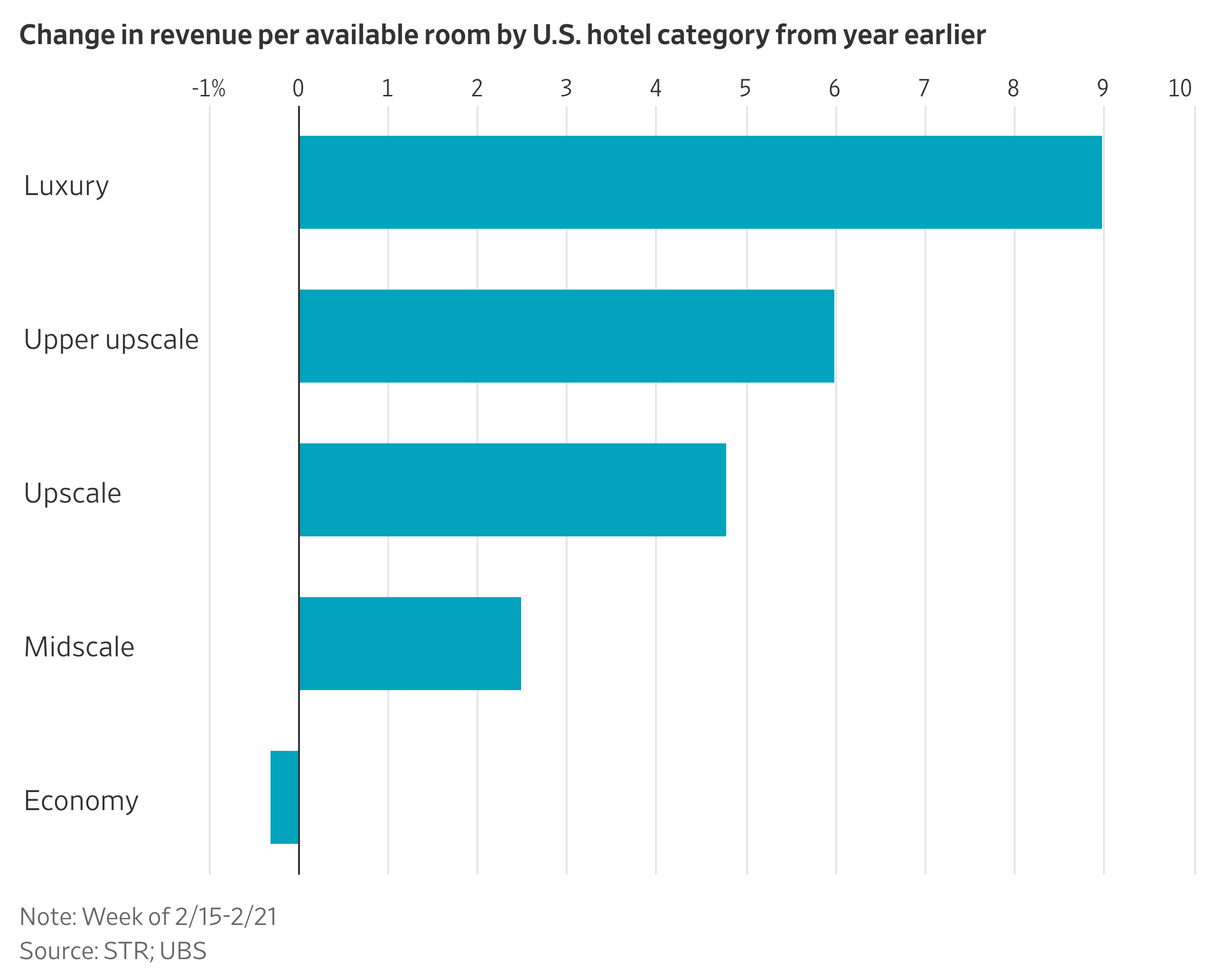 돈이 벌리는 곳은 럭셔리 호텔이다. 평균 일일 요금이 거의 500달러에 달하는 이 부문의 ‘객실당 수익(RevPAR)’은 데이터 제공업체 STR에 따르면 2월 중순의 최근 한 주 동안 2025년 같은 기간 대비 9% 상승했다. 더 저렴한 호텔로 갈수록 이 수치는 점점 낮아진다. 평균 요금이 약 67달러인 이코노미 호텔 부문에서는 RevPAR가 오히려 하락했다.