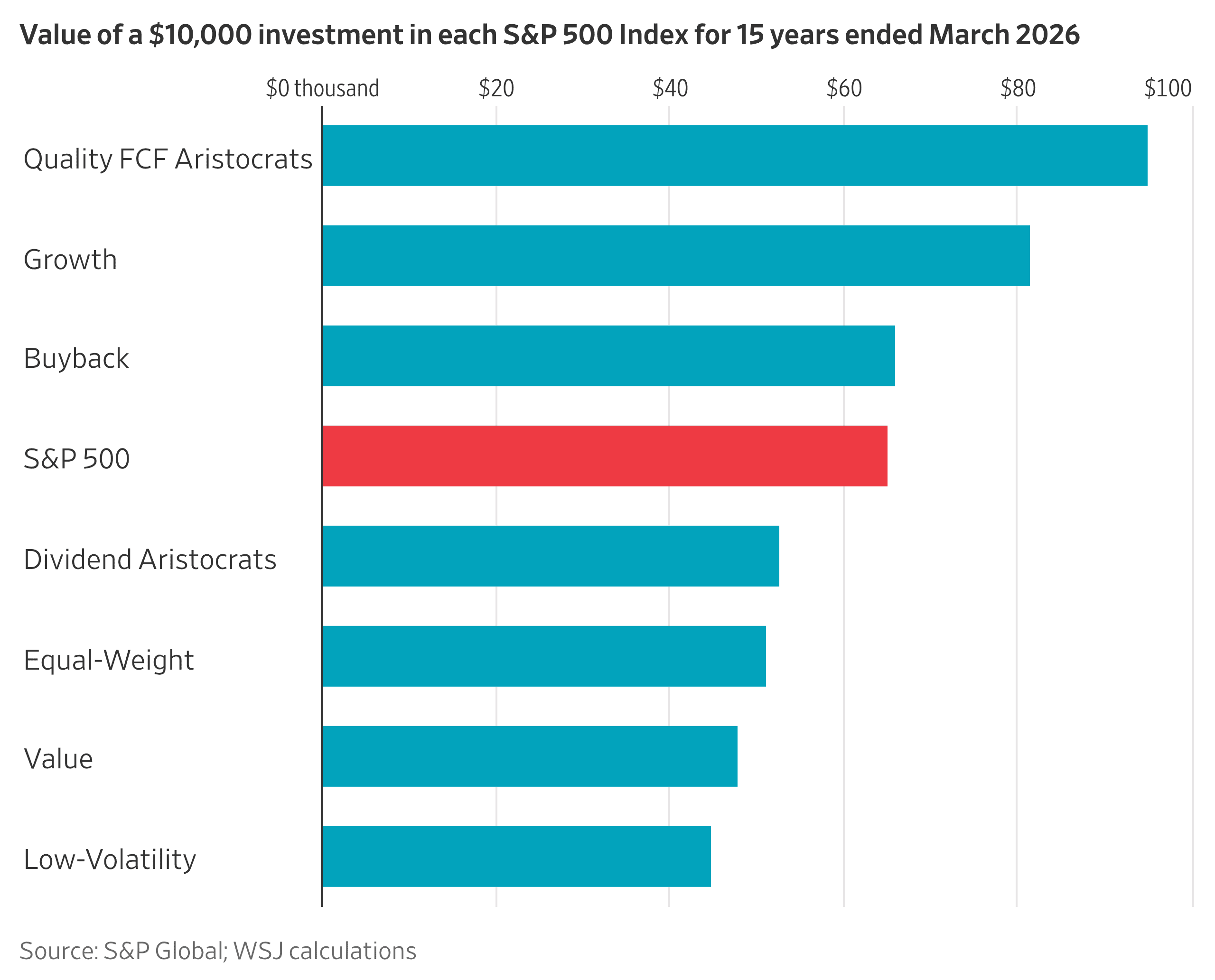 이러한 조합은 2024년에 만들어진 S&P 500 Quality FCF Aristocrats 지수에 반영되어 있다. 계산을 위해 재구성된 이 지수에 지난 15년 동안 1만 달러를 투자했다면, 올해 3월 기준 약 95,080달러로 불어났을 것이다. 이는 S&P 500 가치 지수의 두 배 이상이며, S&P 500 전체보다도 46% 높은 수준이다.