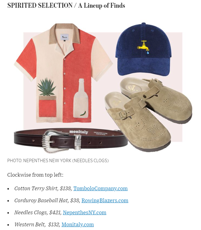 다른 곳에서는 일본 브랜드 Needles가 슬리퍼에 평화 표시 버클을 장착하여 Boston Birkenstocks에 대한 색다른 대안을 제시하는 반면, New York Rowing Blazers의 캡에는 물이 뚝뚝 떨어지는 수도꼭지와 같은 임의의 기호가 특징입니다. 재치 있는 셔츠를 선택하세요. 톰볼로(Tombolo) 버튼업은 "테라코타 화분" 주머니에서 "자라고 있는" 뾰족한 용설란 식물의 프린트를 특징으로 하며, 동료 뉴욕 브랜드 Corridor는 Muppetishly 퍼지 테이크를 판매합니다.